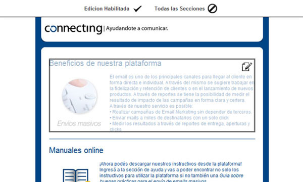 Podes generar tus campañas, cargar los contenidos, crear los textos, subir imágenes, insertar links, agregar o quitar secciones y mucho más de manera independiente. Asimismo podes organizar tus contactos, realizar envíos segmentados y analizar los resultados, todo en un solo lugar.